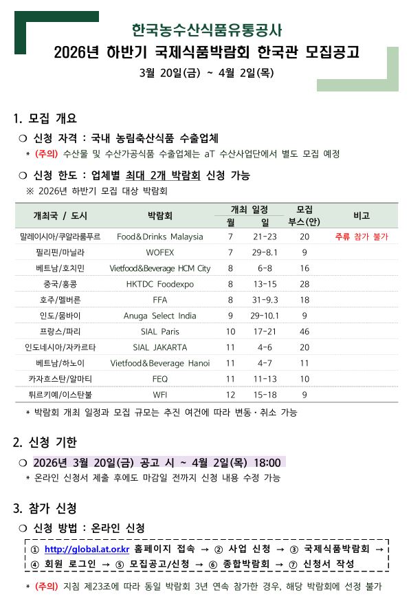 Çѱ¹³ó¼ö»ê½ÄǰÀ¯Åë°ø»ç¿¡¼­ ¡¸2026³â ÇϹݱ⠱¹Á¦½Äǰ¹Ú¶÷ȸ Çѱ¹°ü¡¹¿¡ Âü¿©ÇÒ ±¹³» ³ó¸²Ãà»ê½Äǰ ¼öÃâ¾÷ü ¸¦ ¸ðÁýÇϰí ÀÖ½À´Ï´Ù